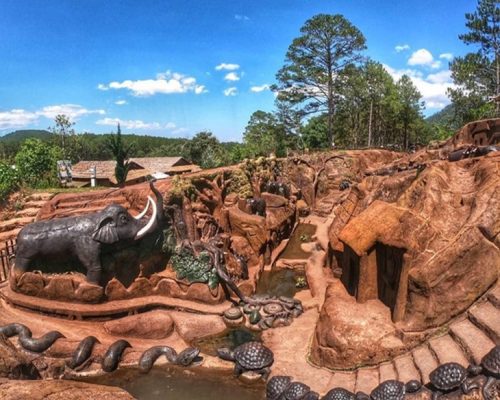 Đây là một kỳ công nghệ thuật độc đáo, dài hơn 1,2 km men theo hồ Tuyền Lâm. Toàn bộ đường hầm là những tác phẩm điêu khắc làm từ đất sét bazan tại chỗ, tái hiện lịch sử hình thành Đà Lạt từ thuở khai hoang đến hiện đại. Bạn sẽ thấy những mô hình đất sét sống động: ga xe lửa, nhà thờ Con Gà, dinh Bảo Đại, thác Cam Ly, thậm chí cả chiếc xe Vespa cổ hay chiếc smartphone khổng lồ, tất cả đều làm bằng đất sét nâu đỏ. Cuối đường hầm là khu vực “hồ Vô Cực” – hồ nước nhân tạo với hai bức tượng đầu người đối diện nhau, là điểm check-in siêu hot trên mạng xã hội.